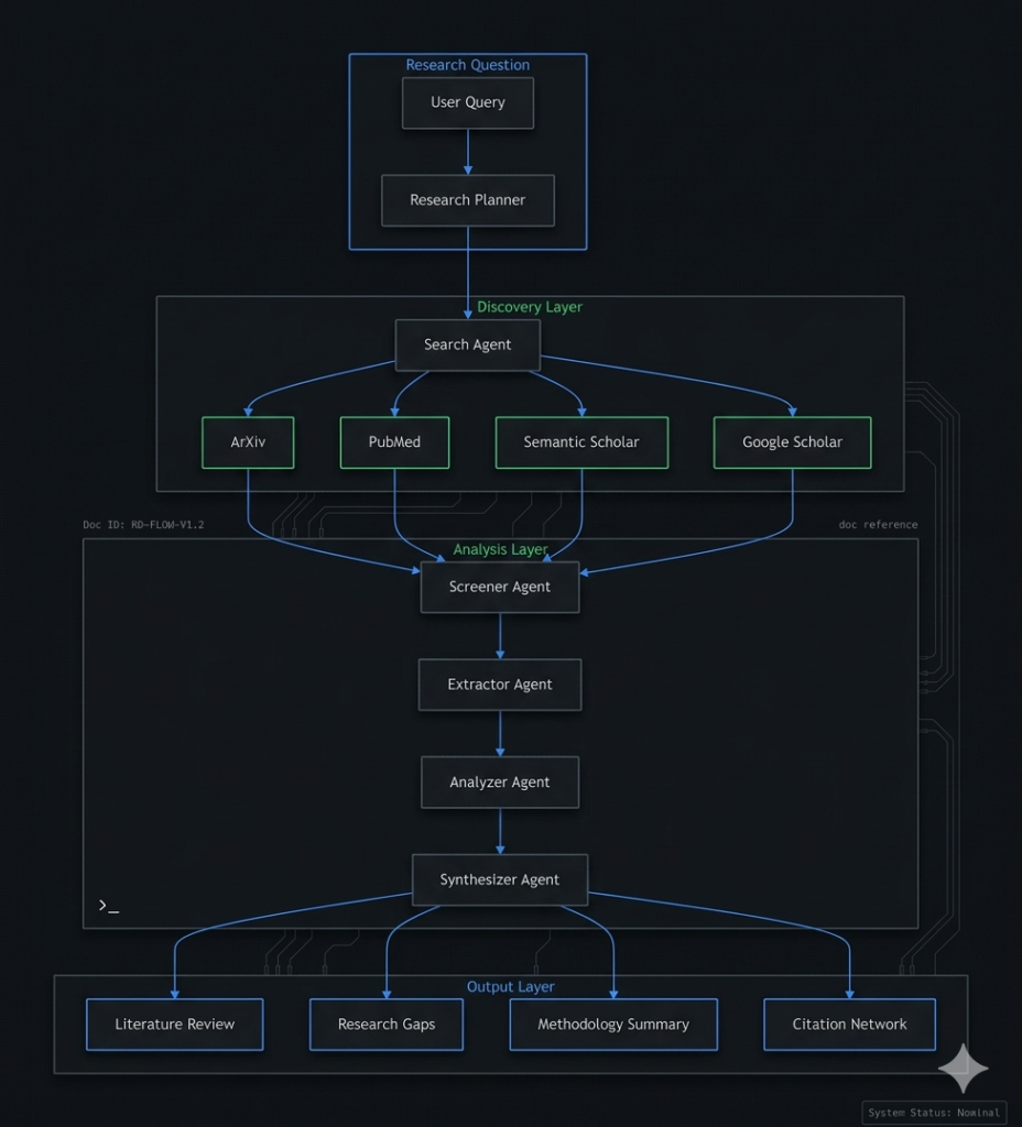 | Research Planner | Strategy design | Understands research question, identifies search parameters, creates workflow plan | Search strategy, inclusion criteria |