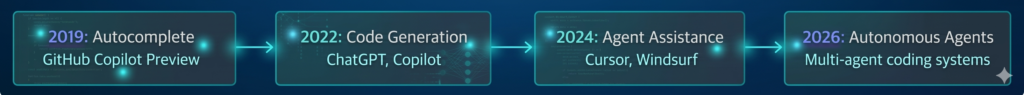 Figure 1: The evolution of AI in software development – from autocomplete to autonomous agents