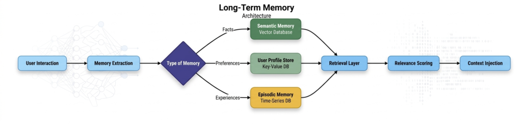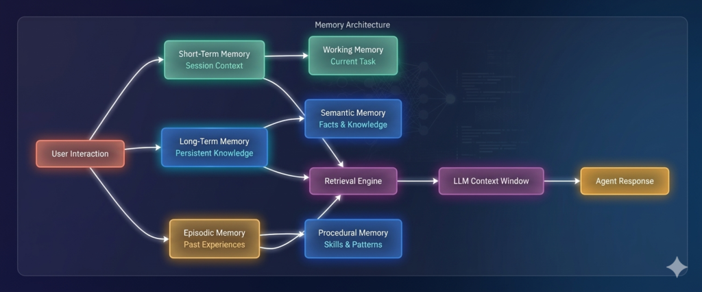 - Long-term memory preserves knowledge across sessions using vector databases, user profiles, and episodic stores