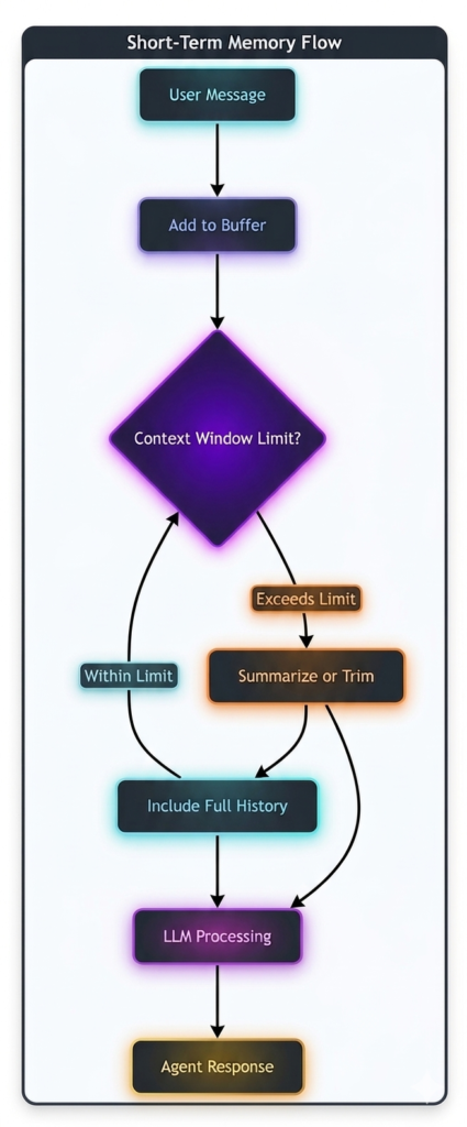 Short-term memory holds information relevant to the current interaction. Implementations include conversation buffers (storing recent messages), buffer windows (keeping last N messages), and conversation summarization (compressing older context) .
