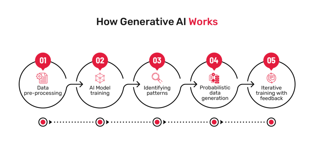 The word “generative” is key. These systems do not simply retrieve or rearrange existing content. They generate novel outputs that have never existed before, following the patterns they learned during training.