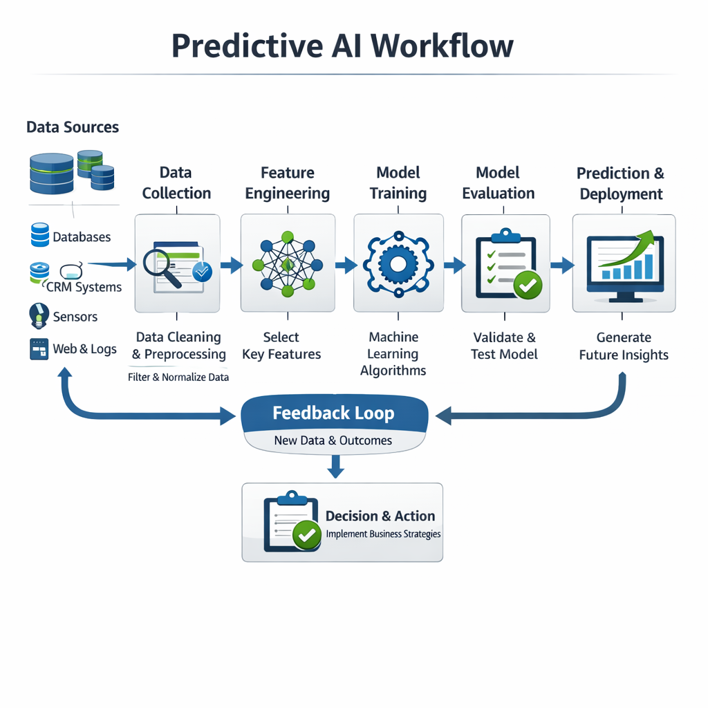Predictive AI models are trained on historical data where the outcome is known. A churn prediction model is trained on customer data where the model knows which customers ultimately left and which stayed. It learns patterns—combinations of behaviors, usage patterns, demographics—that correlate with churn.