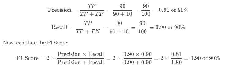 Example. Precision = 80%, Recall = 90%. F1 = 2 × (0.8 × 0.9) / (0.8 + 0.9) = 2 × 0.72 / 1.7 = 0.85 or 85%.