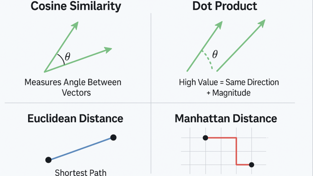 | Cosine Similarity | Measures the angle between vectors | Text embeddings; semantic similarity |