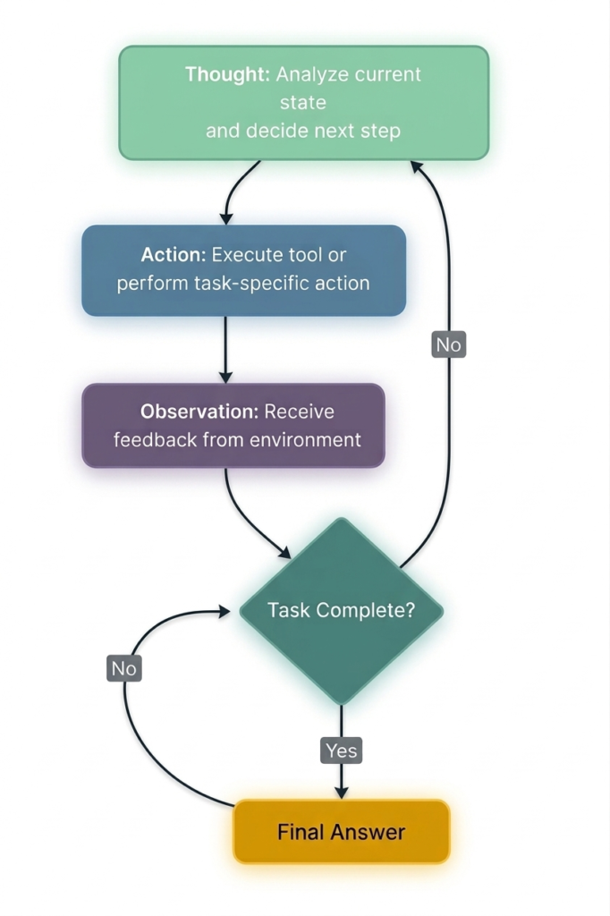 Figure 1: The ReAct cycle – Thought, Action, Observation repeat until the task is complete