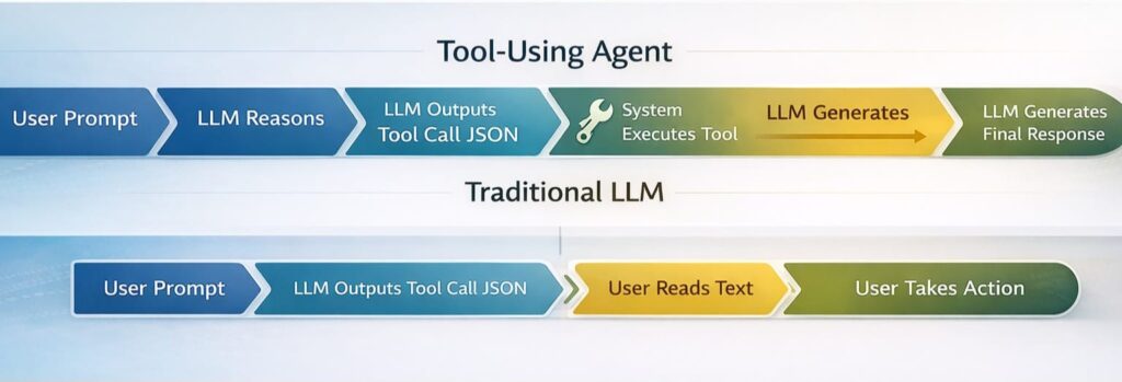 *Figure 1: Traditional LLMs generate text for humans to act upon; tool-using agents generate structured instructions for systems to execute*