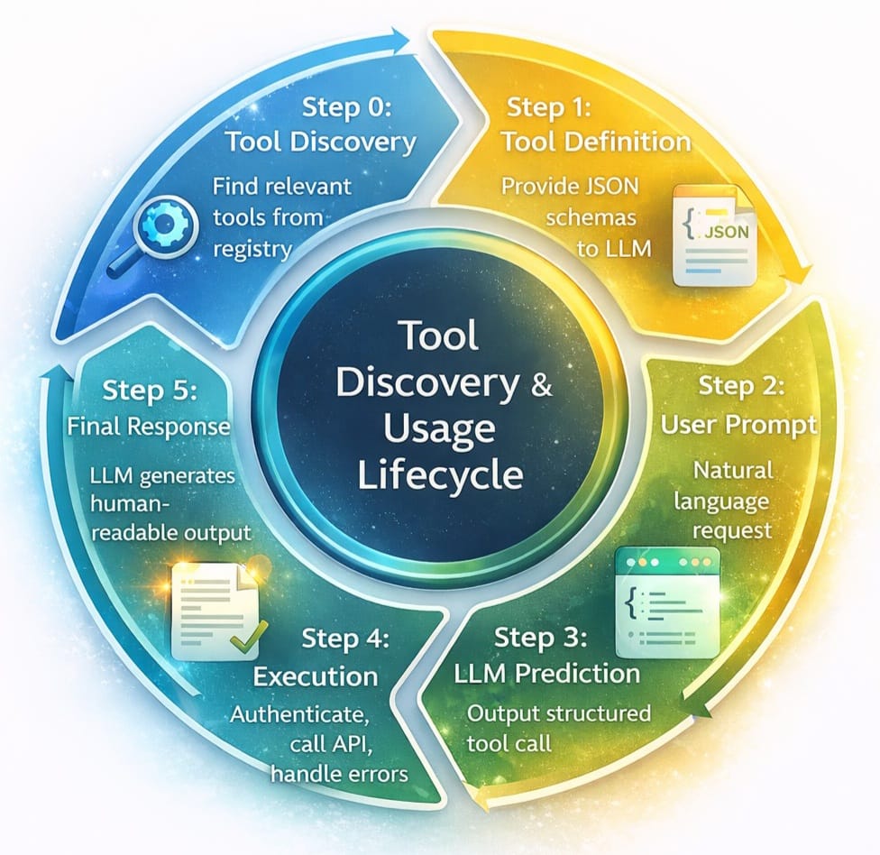 The modern 6-step loop includes: Tool Discovery, Tool Definition, User Prompt, LLM Prediction, Execution, and Final Response .